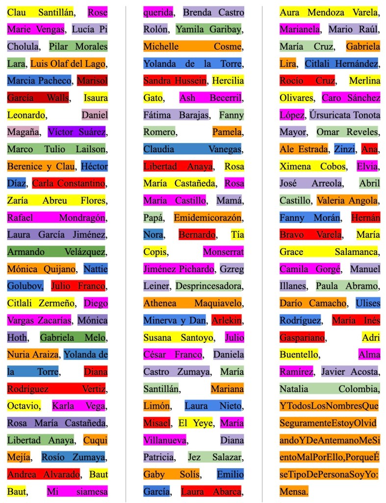 De cualquier modo, este periodo ha tenido demasiados picos, demasiadas vueltas, mareada definitivamente estoy. Pero tuve la fortuna de, en medio de la tormenta, aprender a construir un dique, un gran muro de contención que me protegió y gracias al cual, hoy estoy viva [inserte aquí escena de Frankenstein]. Eso es algo que sólo puedo agradecer y replicar para otras personas. Mi mamá pidió una misa para darle gracias a dios por mi salud. Yo nunca voy a misa, yo no creía en dios, es muy complejo de explicar, pero el miedo y la impotencia le hacen a una abandonar la soberbia. En el sermón el padre dijo que una vez dios salvó a nueve personas, pero sólo una regresó a dar las gracias. Me impactó. Yo no entiendo la vida sin el agradecimiento, incluso si las circunstancias me alejan de aquellos que alguna vez me tendieron la mano.